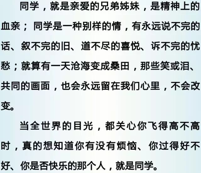 同学它是存在于我们心中最珍贵的记忆或真谛。在你失意或悲伤的时候,它给你以抚慰;在挫折的时候,它给你提供价值感和方向感;在你老去时,可以回味、品味,使你重温年少,重度青春......